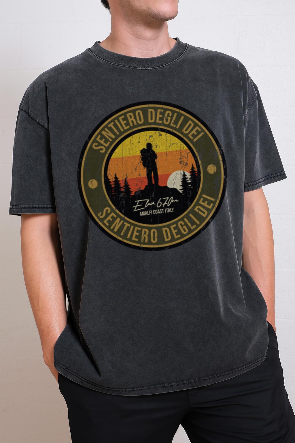 Commemorate your epic journey along the Sentiero degli Dei (Path of the Gods) with this unique Italy Mountain T-shirt. Perfect for hikers, trekkers, and lovers of breathtaking Italian landscapes, this graphic tee captures the spirit of adventure. Crafted from 100% heavyweight cotton with a distinctive black acidwash finish, it offers comfort and a stylish reminder of the stunning Amalfi Coast trails.