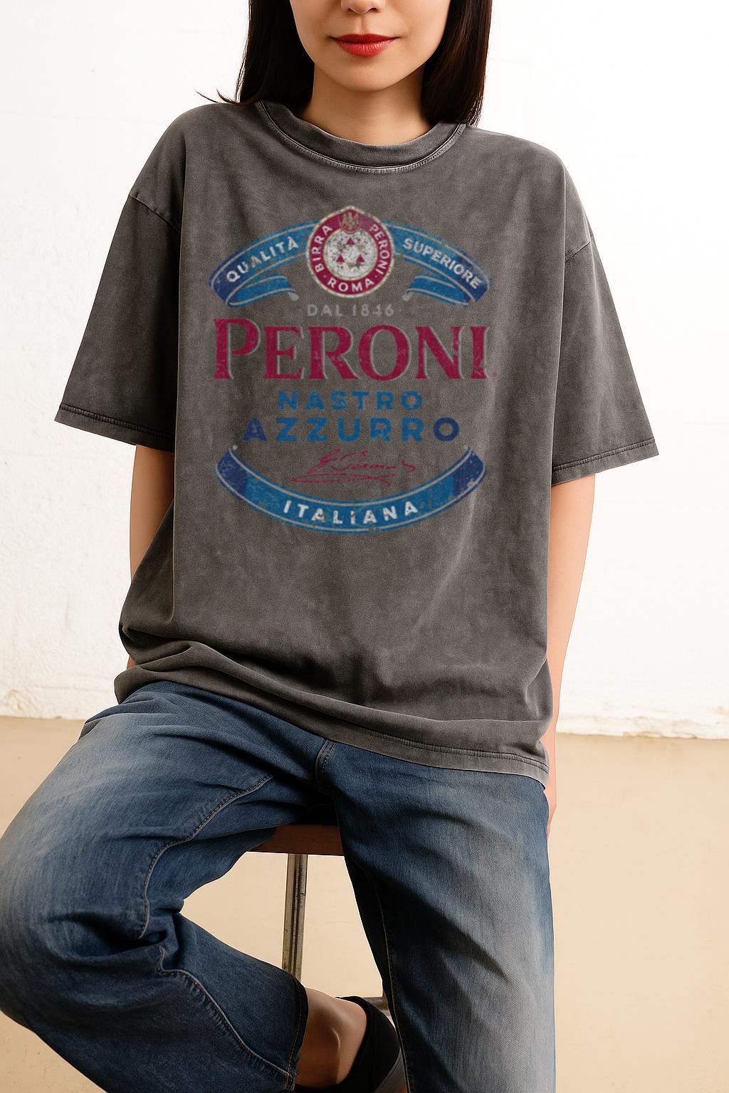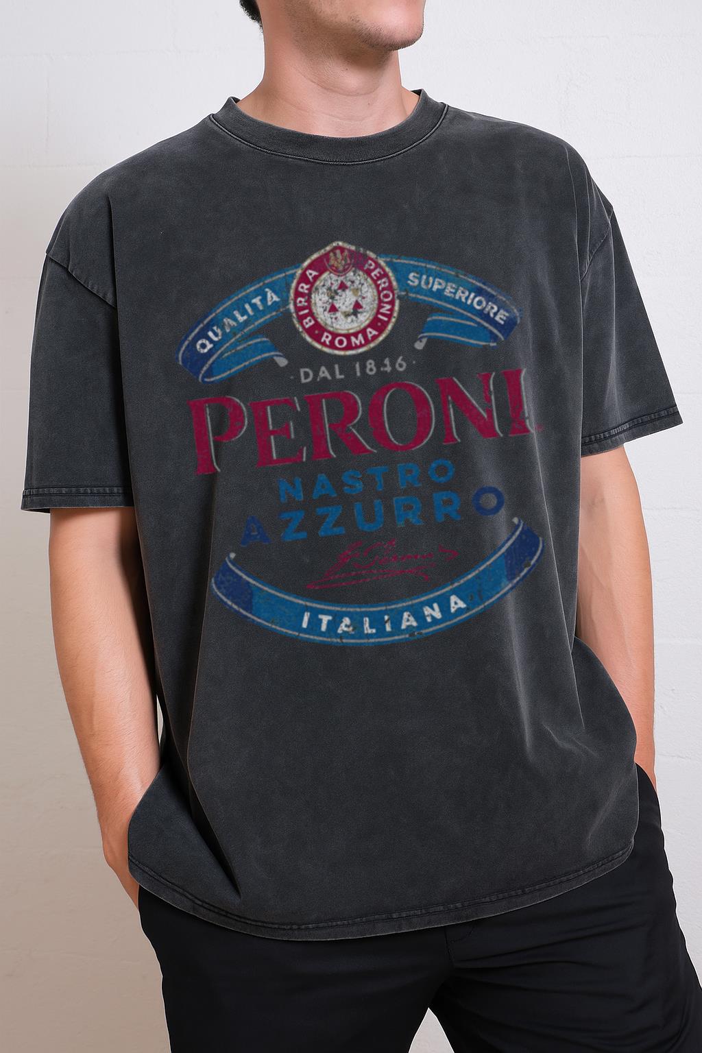 Celebrate the iconic taste of Italy with our **Peroni Nastro Azzurro T-shirt**! This fan-inspired graphic tee pays tribute to the classic Italian lager, perfect for beer enthusiasts and lovers of Italian culture. Crafted from soft 100% heavyweight cotton with a distinctive black acidwash finish, it’s ideal for casual wear, pub nights, or your next European adventure.