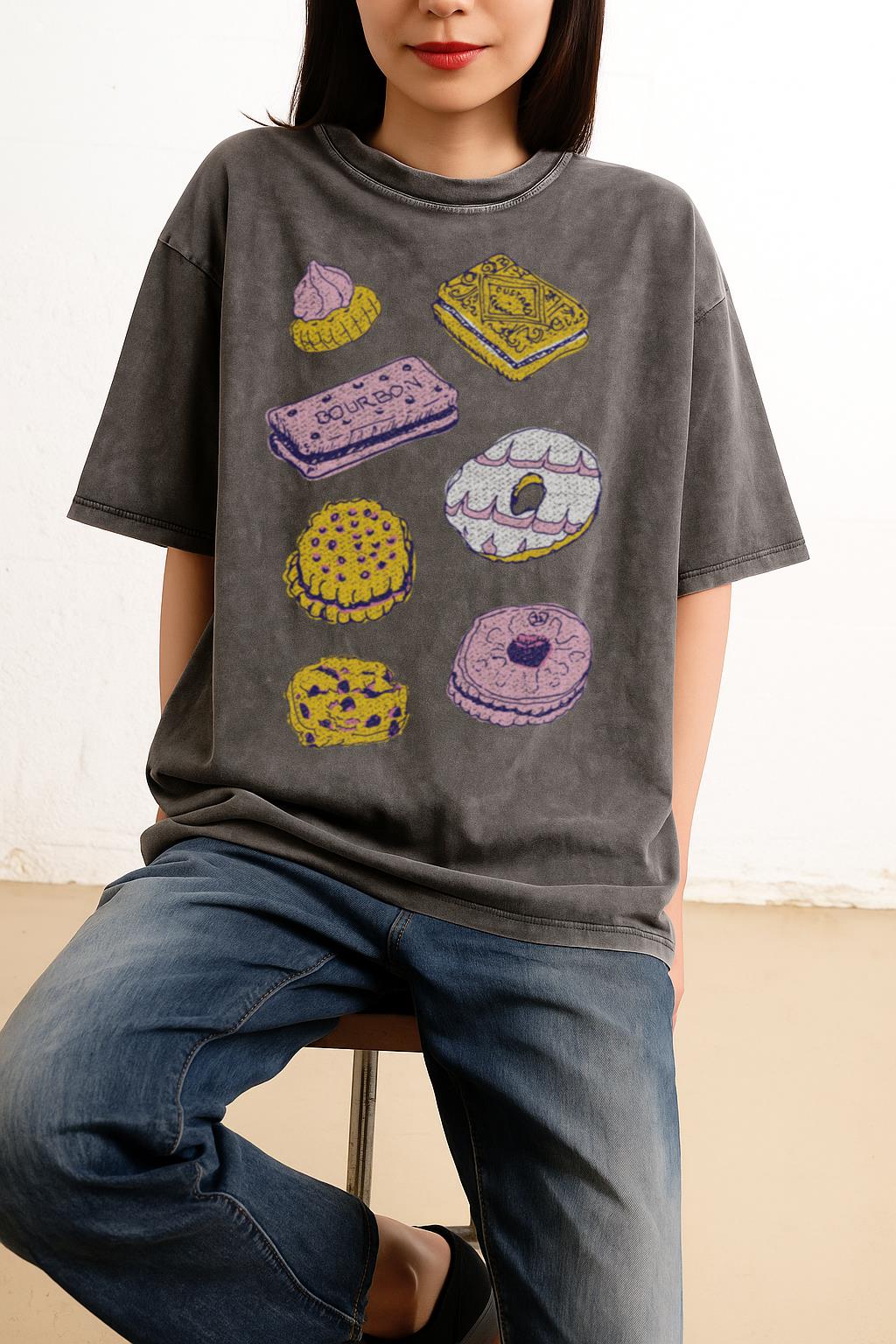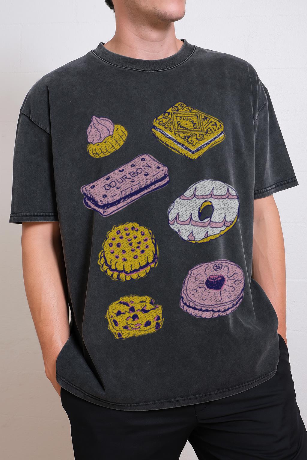 Indulge your sweet tooth with our delightful **Pink Biscuits T-shirt**! This charming, hand-drawn graphic tee features an array of classic biscuits, bringing a touch of vintage charm and nostalgia to your wardrobe. Crafted from soft 100% heavyweight cotton with a unique black acidwash finish, it’s the perfect apparel for foodies, bakers, and anyone who loves a good tea and biscuit moment.