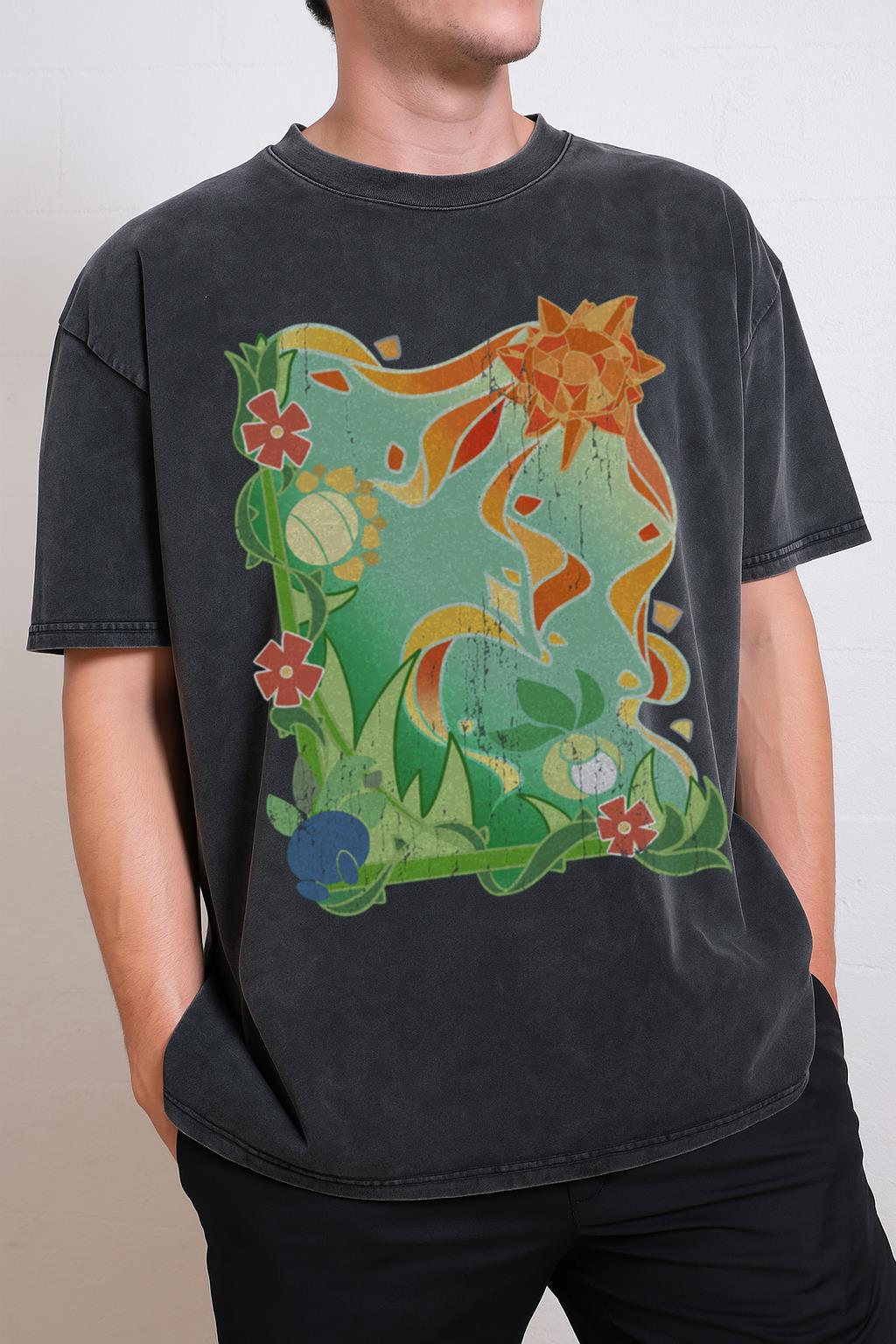 Embark on a sunny adventure with our **PKM Sun Stone Frolic T-shirt**! This fan-created graphic tee captures the joyful spirit of **Pokemon** evolution, featuring beloved characters like Bellossom, Oddish, Petilil, and Sunflora. Crafted from soft 100% heavyweight cotton with a unique black acidwash finish, it’s the perfect apparel for gamers and anime fans alike.
