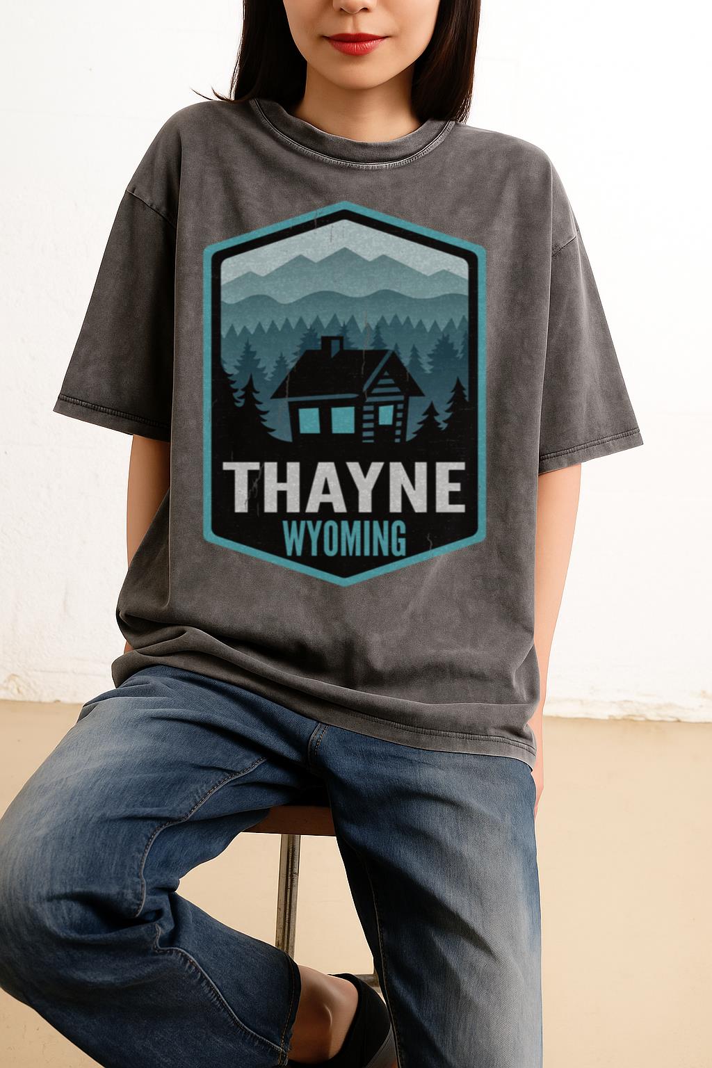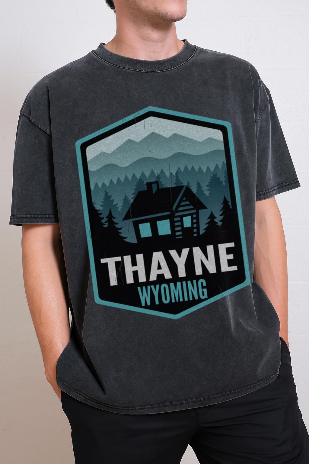 • Scenic Thayne Design: Showcases a beautiful graphic of a mountain cabin in Thayne, Wyoming, capturing the essence of wilderness and rustic charm.