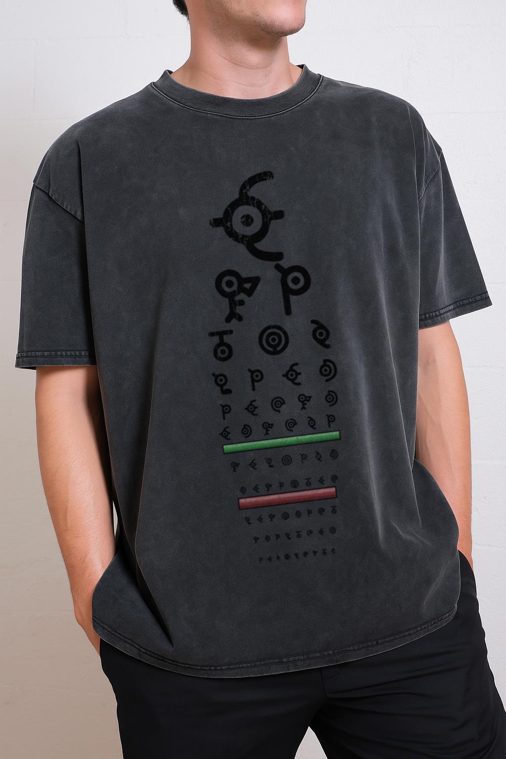 Test your vision and your Pokémon knowledge with this Unown Eyesight Chart T-Shirt! This clever design features the mysterious Unown characters arranged like a classic eye exam, making it a perfect blend of gaming humor and medical parody. Crafted from 100% cotton with a distinctive black acidwash, this tee offers a regular fit and dropped shoulders for comfortable wear, ideal for Pokémon trainers, optometry professionals, or anyone with a good sense of humor.